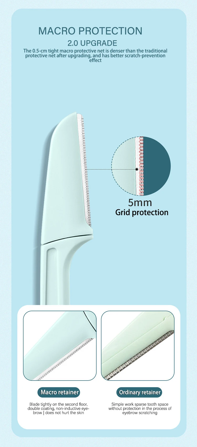 Function: Macro protection version 2.0 is safe and scratch-resistant, 0.5CM tight macro protection net, which is denser than the traditional protection net after the upgrade, and has better anti-scratch effect. , No feeling to shave eyebrows, does not hurt the skin, 180 ° rotation to fold at will, better control of the eyebrow trimmer, not easy to scratch, more convenient to carry at home and travel.