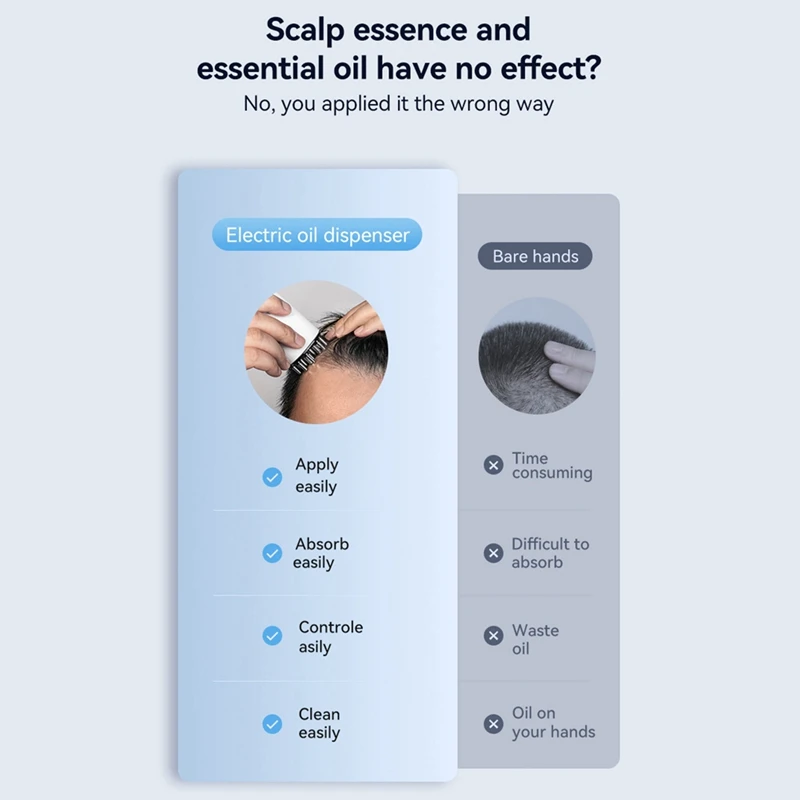 [Precision & Efficiency with Elastic Liquid Teeth]: Provided with four elastic liquid teeth, the applicator directs the oil or treatment directly to the hair roots in place of just the surface, ensuring even distribution without mess. perfect for use with minoxidil, essence, conditioner, nutrient solution, and essential oils.