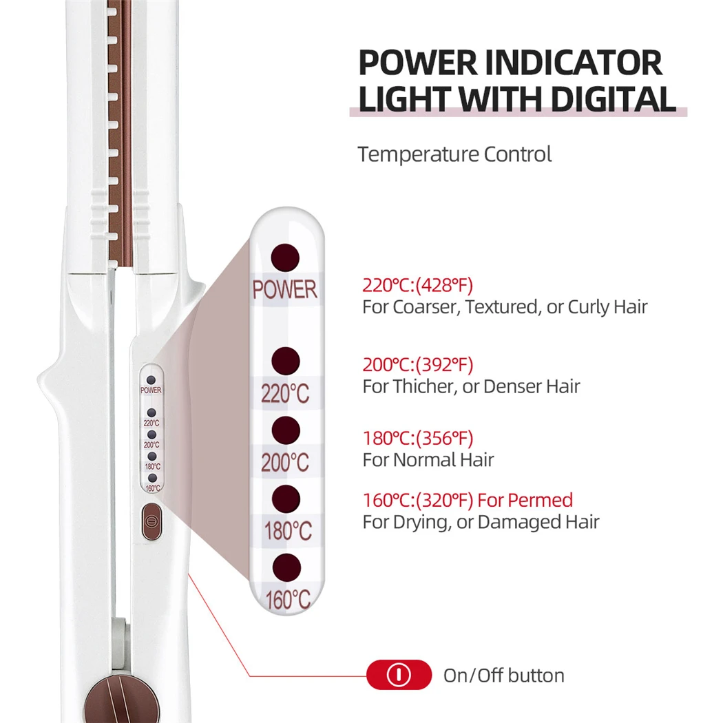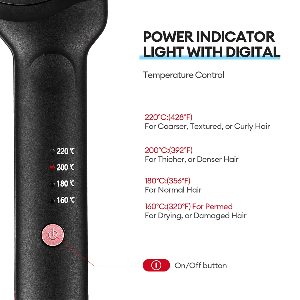 4 adjustable temperatures: 160 C, 180 C, 200 C, 220 C. Allows you to adjust the temperature according to different hair.