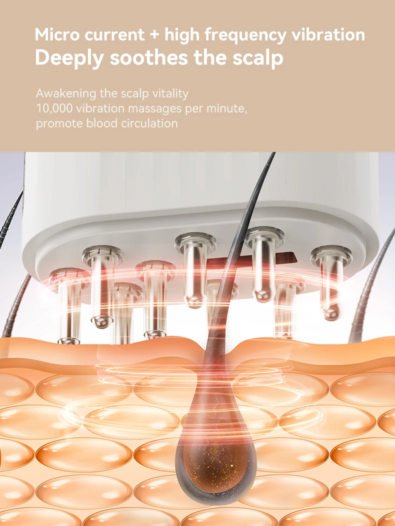 1. Micro-current + high-frequency vibration massage deeply soothes the scalp, promotes blood circulation, allows the nutrient solution to reach the hair roots, and better promotes the absorption of nutrients by the scalp.