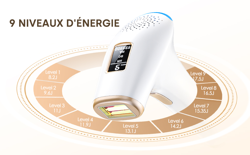 【9 Adjustable energy levels】 Our laser epilator features 9 adjustable energy levels with 999,900 flashes to adapt to different skin sensitivities, offering different levels of the most precise, complete and effective treatment experience. The higher the energy level, the better the hair removal results. So start with the lowest level, then the highest.