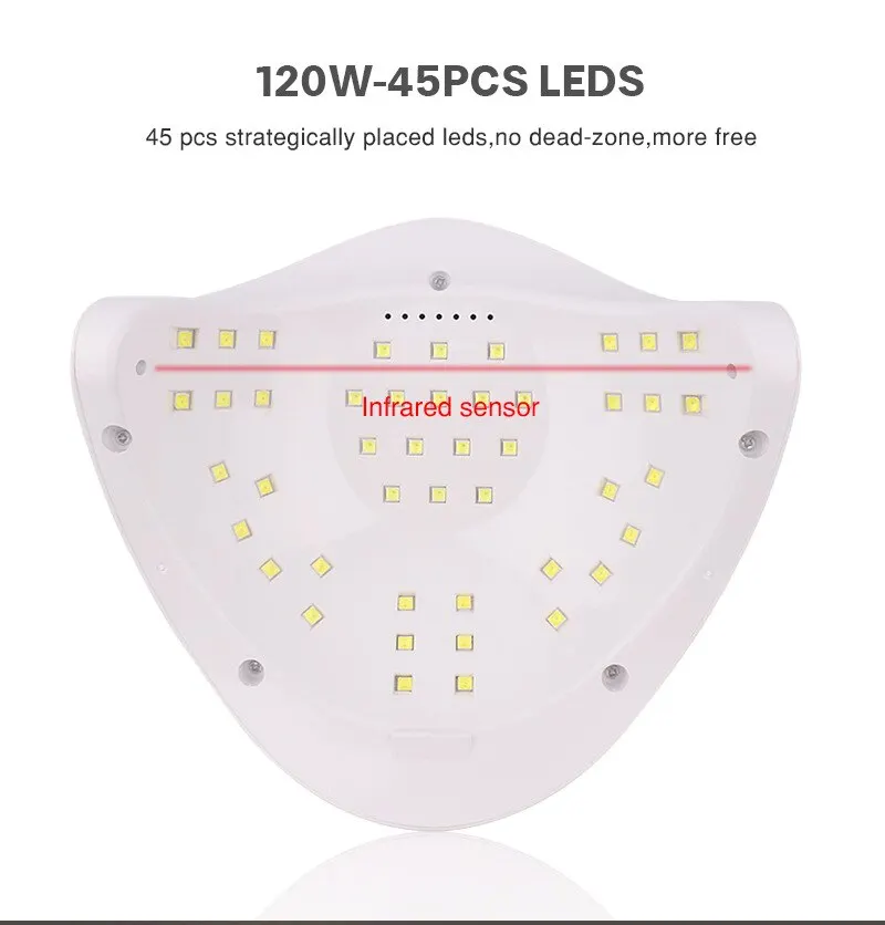 120W high-power lamp beads, large space, portable nail art, intelligent sensor, multi-speed timing, painless mode, LCD screen display, no glare, no black hands, dual light sources, infrared induction, magnetic adsorption base plate.